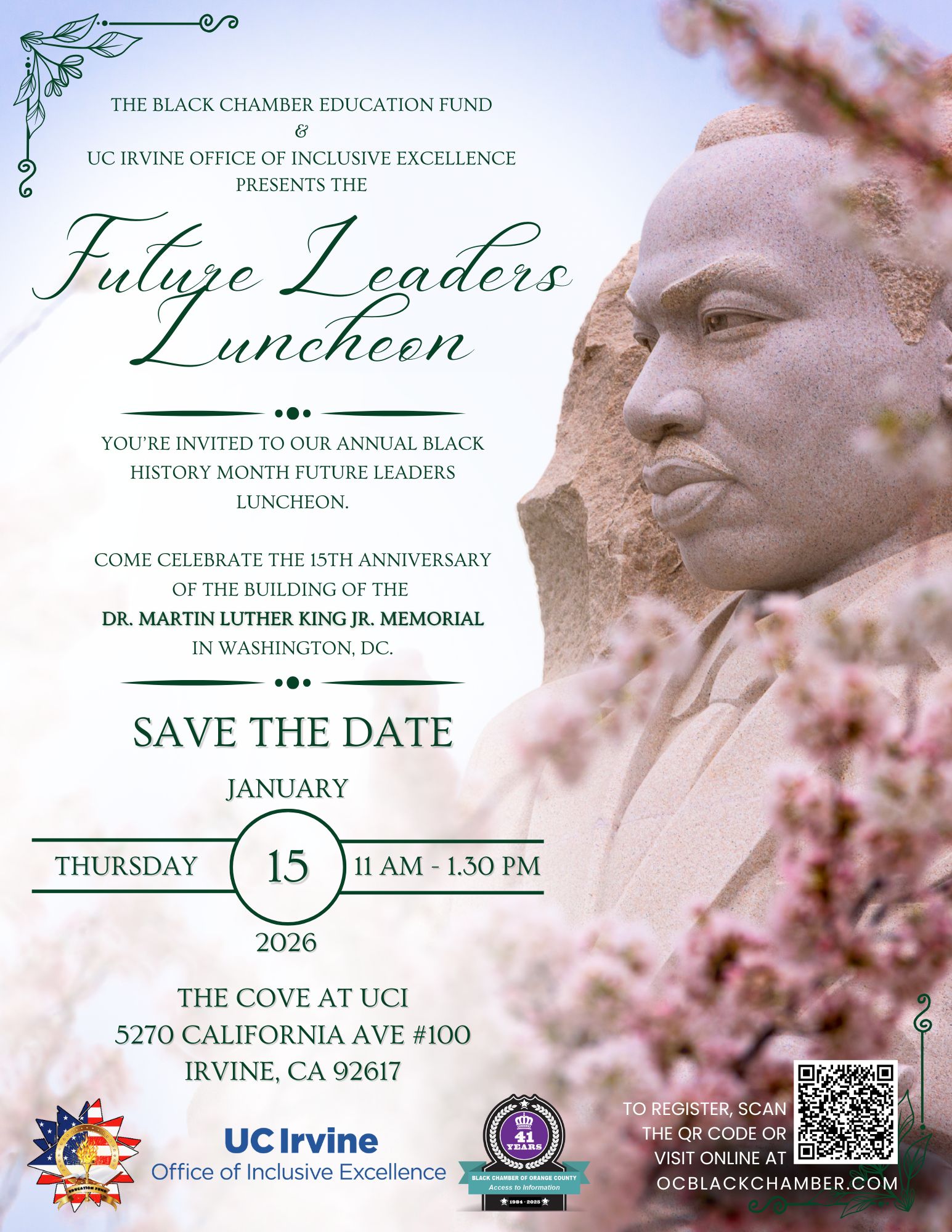 In partnership with the Black Chamber Education Fund and the UC Irvine Office of Inclusive Excellence, the Black Chamber of Orange County presents our annual Black History Month Future Leaders Luncheon. In honor of the 15th anniversary of the building of the Martin Luther King Jr. Memorial in Washington DC, we take a look back on the message of Dr. Martin Luther King Jr as we turn towards today.